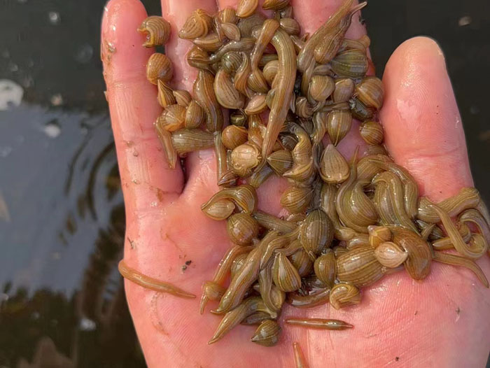 以下列圖片為例,從下水苗開(kāi)始都有它合適的飼料。我把手指當(dāng)參照物你們可以看出螺的大小和水蛭小苗的大小。養(yǎng)小螺是為了和水蛭小苗同步,多大的苗就有多大的小螺來(lái)喂養(yǎng)。有可口的飼料可使水蛭小苗減少生病,原因很簡(jiǎn)單這么小的螺絲水蛭小苗一口一個(gè),余下螺絲頭吃不了的只有一點(diǎn)點(diǎn),這一點(diǎn)點(diǎn)會(huì)被水里的微生物很快分解掉。所以水蛭小苗就吃不到變質(zhì)的食物,自然就少生病,讓小苗健康的成長(zhǎng)。只要你們精養(yǎng)小苗這關(guān)過(guò)了,蛭富夢(mèng)就能實(shí)現(xiàn)。也不要去買高價(jià)小苗來(lái)養(yǎng)殖,可以自繁自養(yǎng)這樣可以讓自己少投入一半的錢,只要每步多要做到精打細(xì)算養(yǎng)水蛭才能有錢掙。